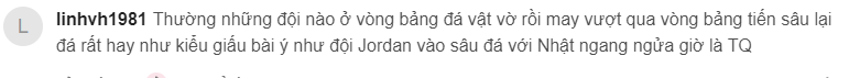 这位叫MK的球迷暗讽越南队道:必须承认,中国队在这场比赛中表现非常出色,能够在恰当的时机刚柔并济。某些球队能够闯入半决赛,其实已经超出了预期。只有主教练和一部分球迷有些过于乐观和不切实际,才刚取得这点成绩,就觉得自己已经达到亚洲一流水平,可以压制所有对手(上图)。