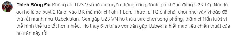 有球迷批评越南方面对中国队的轻视(下图):不仅是越南 U23,连媒体其实也都低估了中国 U23。什么“两层大巴”、什么“进了半决赛才进 1 球”之类的评价。其实中国之所以那样踢,是因为对手是像乌兹别克斯坦这样非常强的球队。
